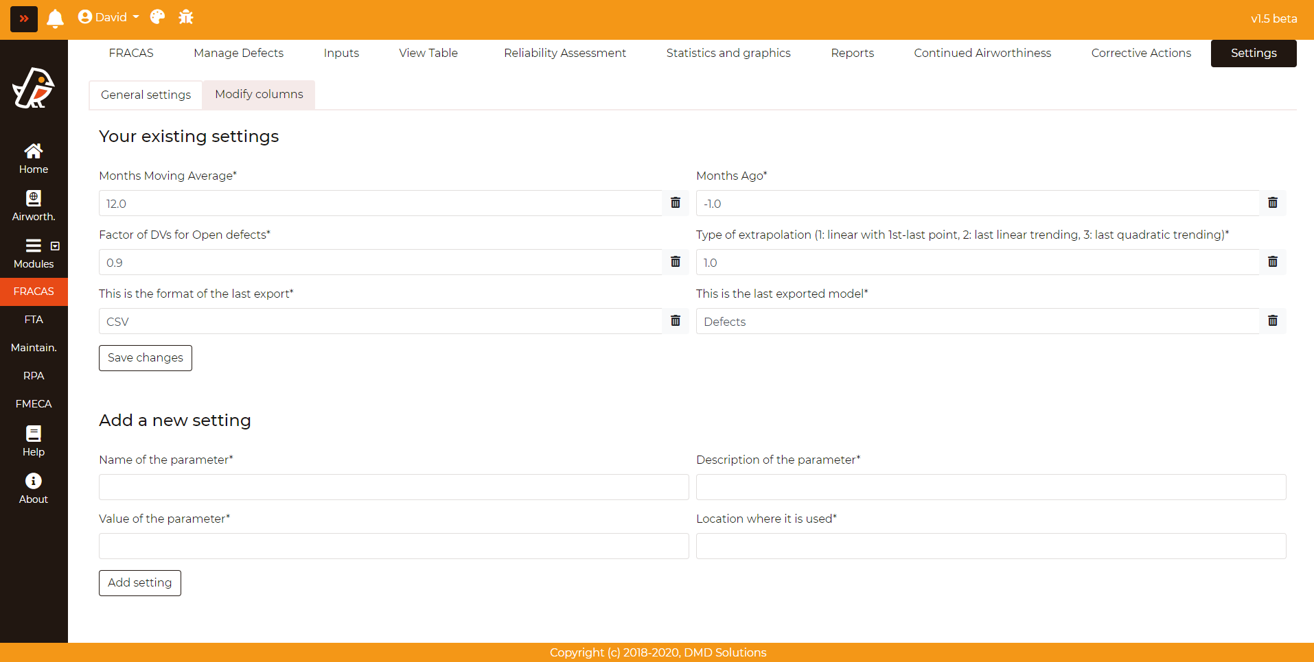 The main settings of FRACAS (for reliability assessment and for exporting) can be modified by accessing FRACAS > Settings > General Settings. A new setting can be also added by specifying the following fields: