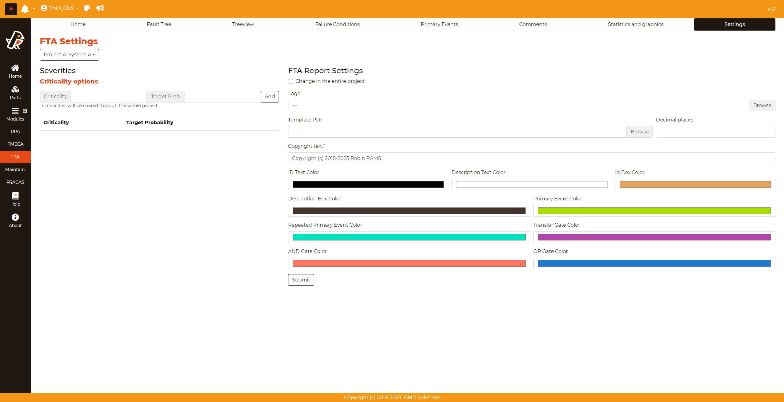 By selecting the desired system in the top-left dropdown, the user can customize various properties that will be reflected in the PDF report. These properties include the logo, the copyright text, colors for different types of nodes, and the display precision for decimal numbers.